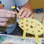 4. Use your index finger and brown paint again to create brown spots on all three of the dry yellow painted clothespins.