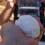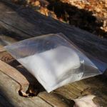 7. Quickly, slip the paper ball into the water and vinegar filled baggie, zip it completely closed, toss it on the ground and run back from it quickly. Make sure spectators are a good distance away as well.