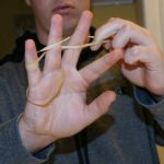 - Place a rubber band over your first and second fingers while keeping your hand open.